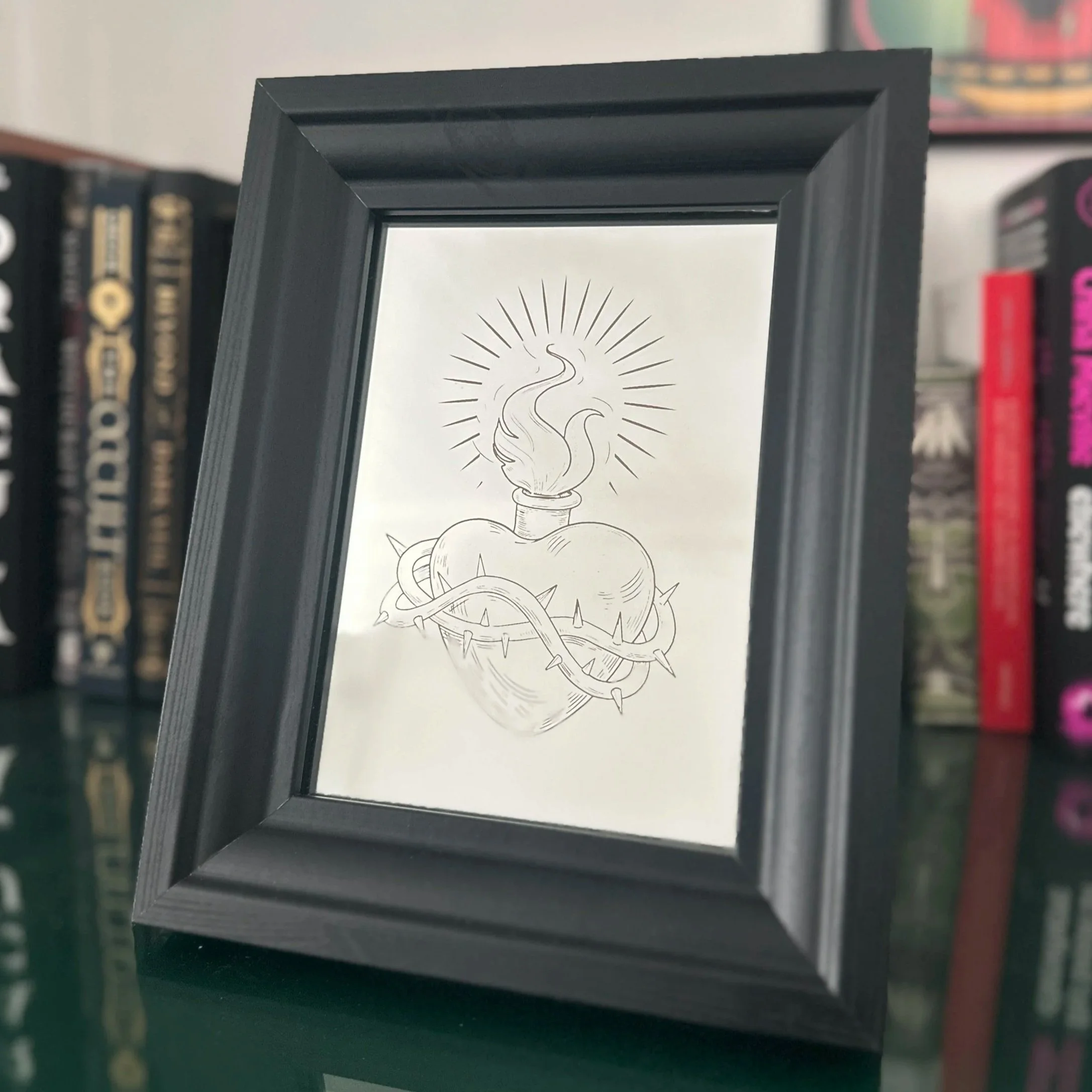 A striking black framed mirror featuring an intricately etched Anatomical Ribcage & Torso Etching design, with the etching carefully highlighted with a white paint to make the details truly stand out.