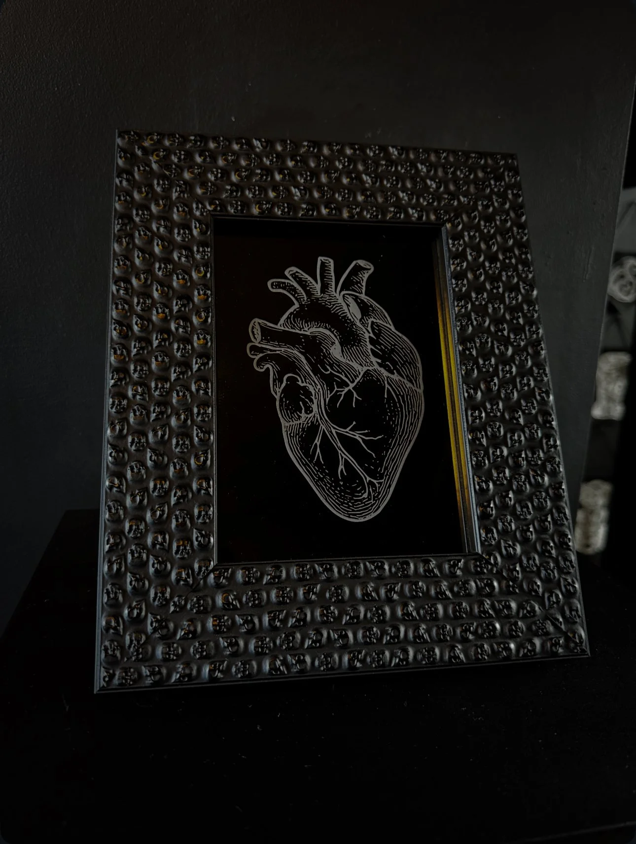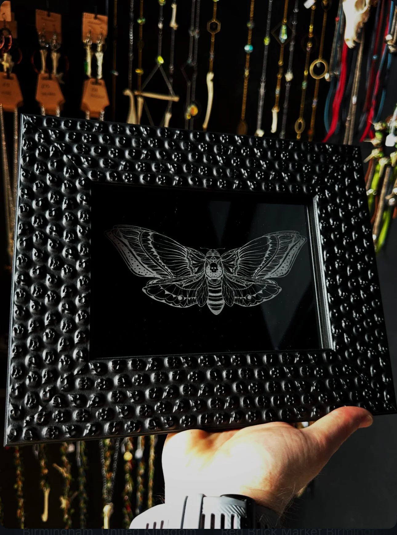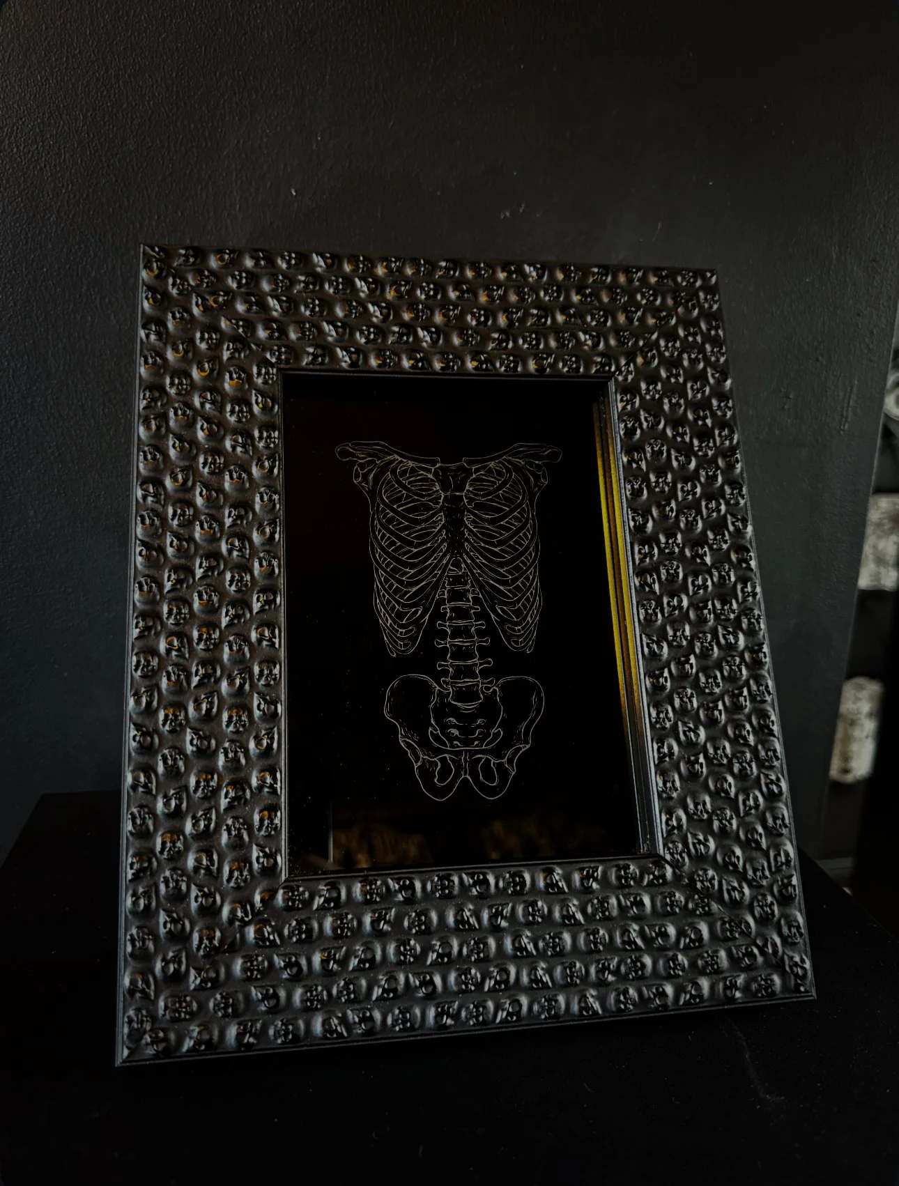 The skull frame itself is a wooden frame available in black from us, it can be also in gold and bronze on request.