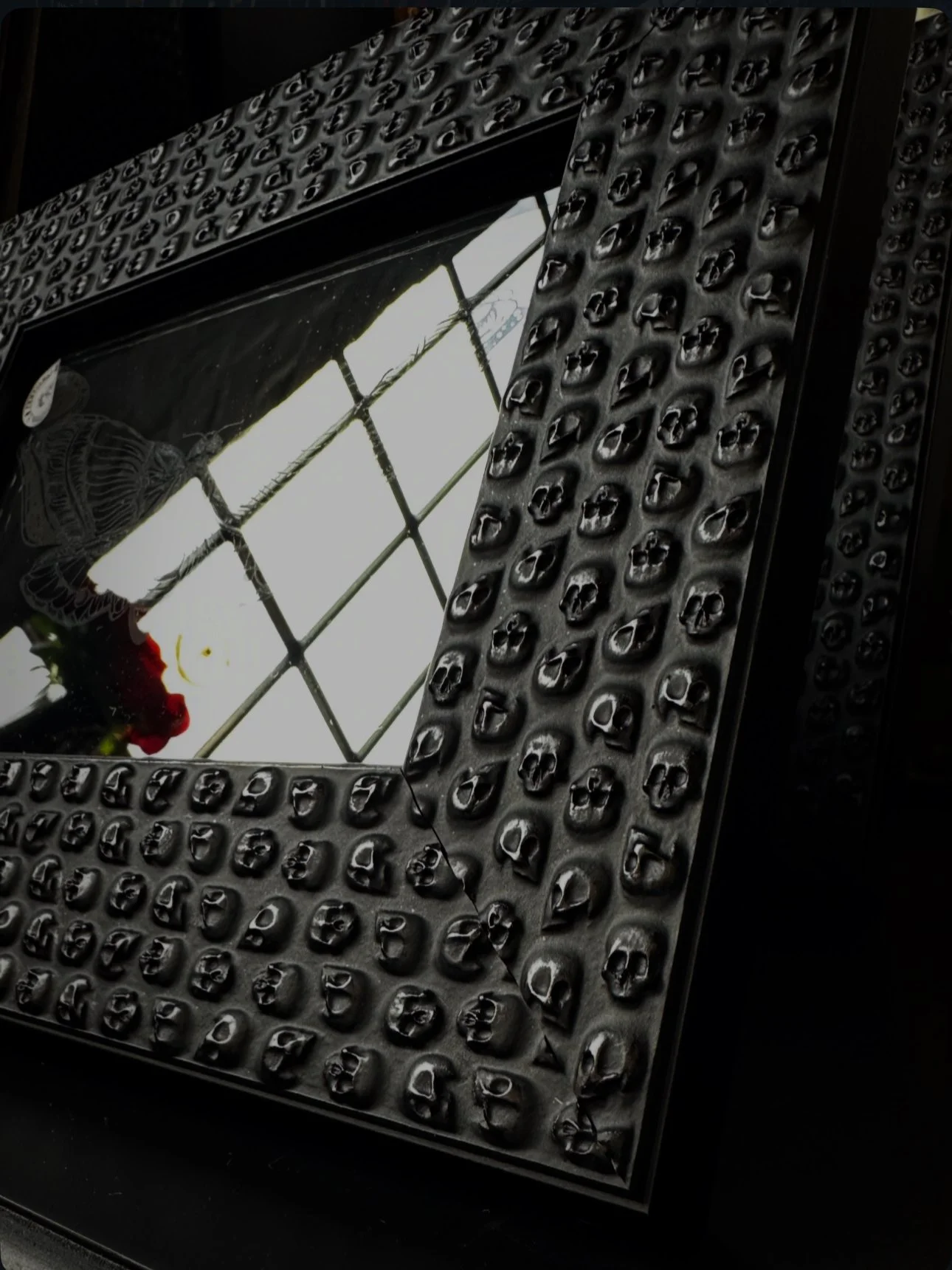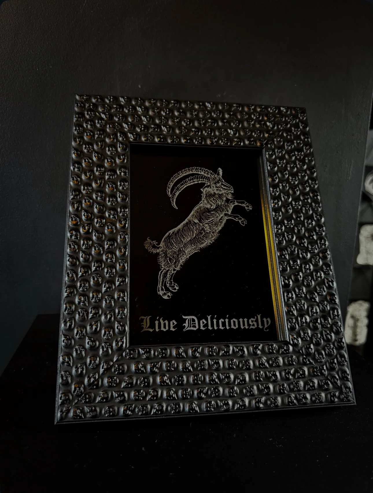 A striking black skull embedded frame with a dark grey mirror featuring an intricately etched Black Phillip & a snippet from his famous line to Live Deliciously, with the etching carefully highlighted in a colour to make the details truly stand out.